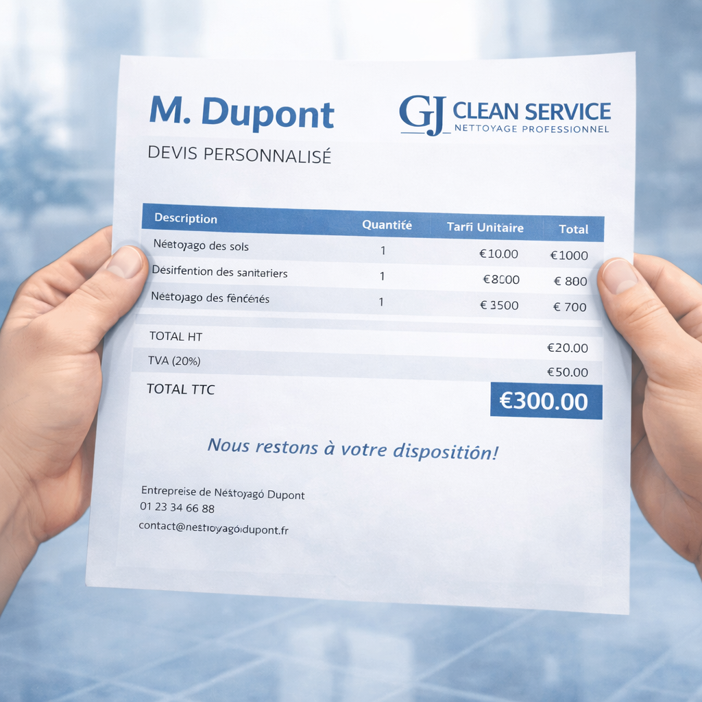 La prochaine étape est simple : contactez GJ Clean Service pour obtenir un devis personnalisé. Expliquez-nous vos besoins (type de nettoyage, surface, fréquence) et nous vous proposerons une solution claire, adaptée et sans engagement.